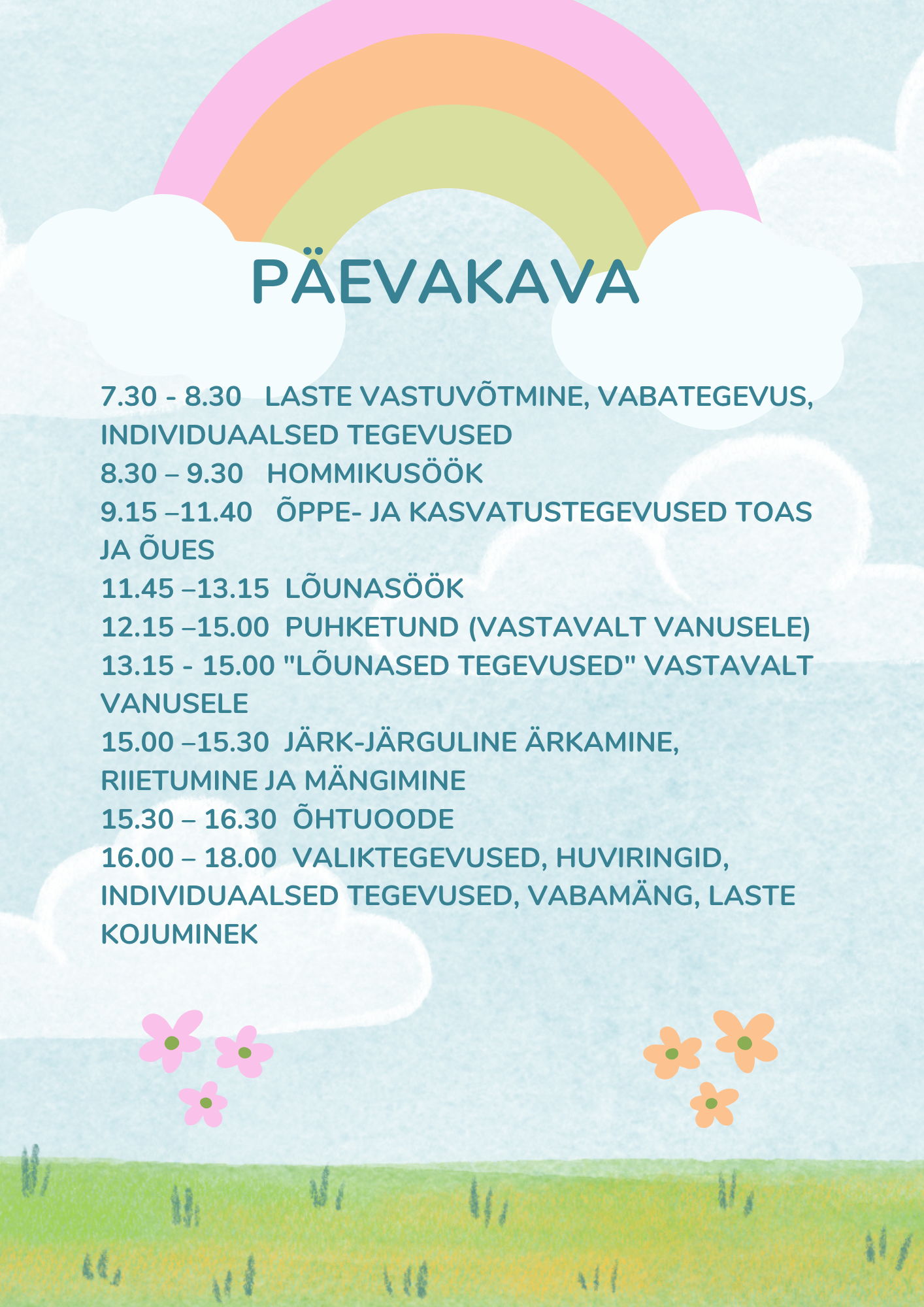Lasteaia päevakava on ülesehitatud nii, et see annaks lapsele turvatunde ja kindla rütmi. Lasteaias toimub õppimine läbi mängu- ja igapäevategevuste- seega iga päevaplokk on ka õppeprotsessi osa. Oleme oma päevakavas välja toonud eraldi liikumise, söömise, puhkeaja.